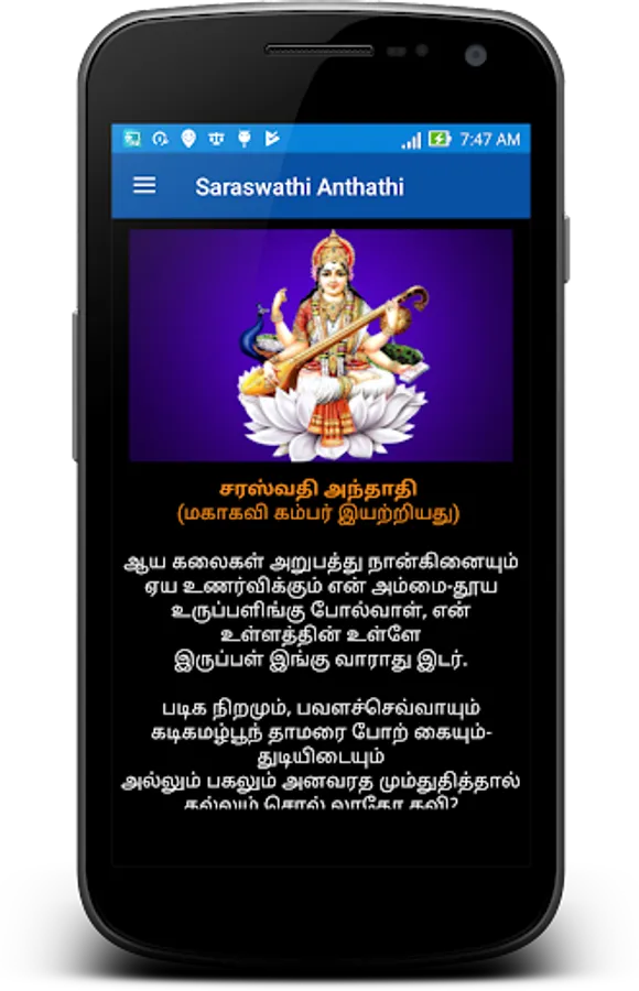 This App is a humble offering at the feet of Saraswathi devi. Saraswati is the Hindu goddess of knowledge, music, arts.