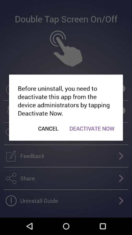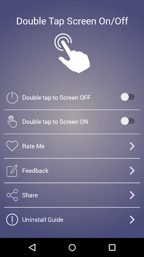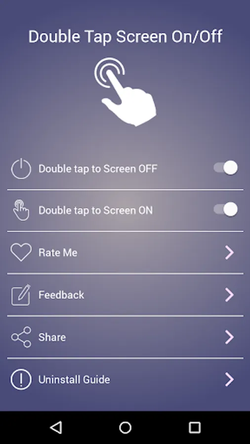 Double Tap Screen On/Off is an easy to use application, by which you can double tap on Home Screen to on/off the screen instead of pressing power button. Double Tap Screen On/Off will help you to minimize the usage of power button.