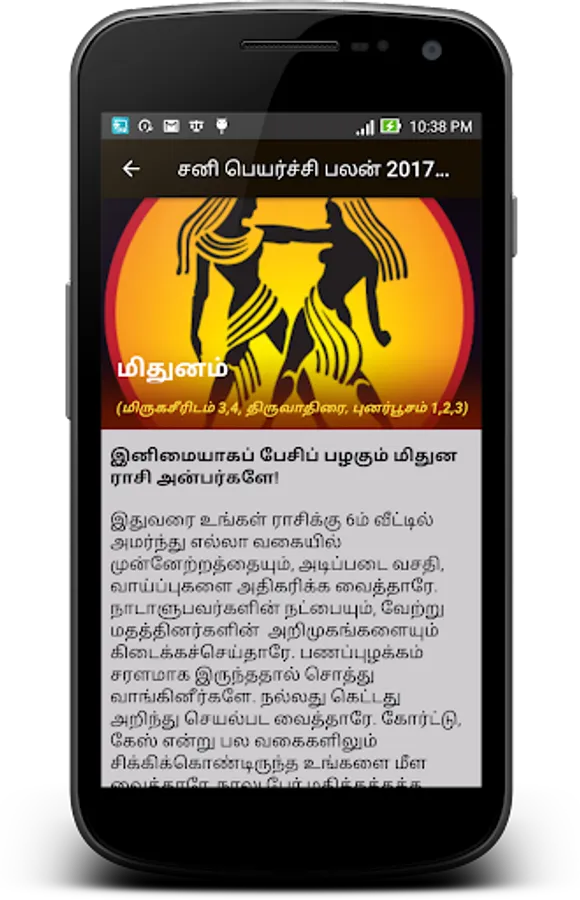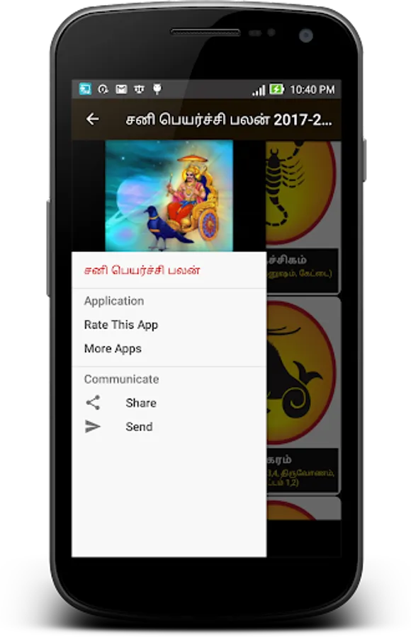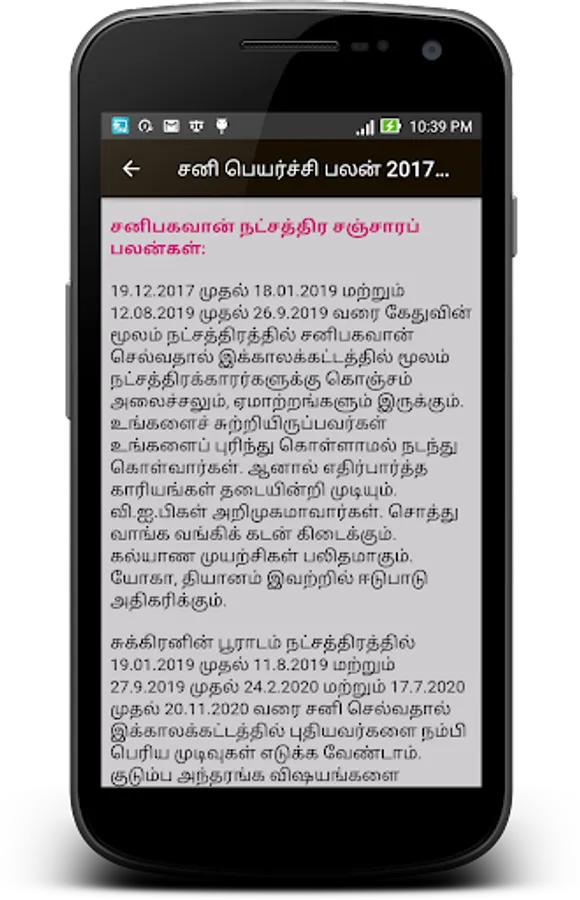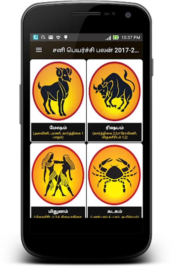 By using this app you may know the Sani Peyarchi (Saturntransit) whether good or bad for your raasi. If it is bad, you will get to know the parikarankal.