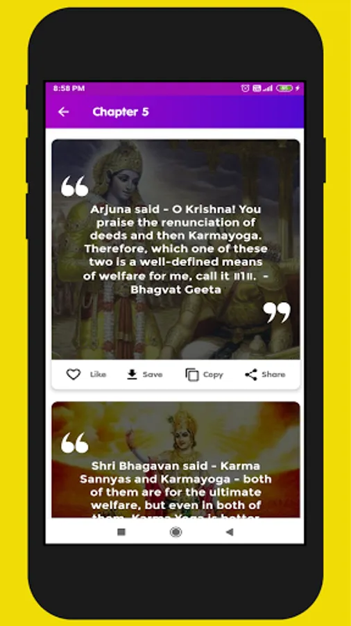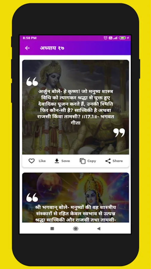 This App Contains Complete Shrimad Bhagwat Geeta In Hindi and English language and it also has Shree Krishna Quotes which is also known as Geta Ke Anmol Vichar in Hindi. This App intends to provide ashtravakra maha geeta along with bhagvad Geeta for free of cost, it contains bhagvad gita shlokas in hindi language. So read bhagwat geeta and spread the light of hinduism and great shree krishna ke anmol vichar in hindi language, bhagvad geeta hindi book is very nicely and understandable hindi language.