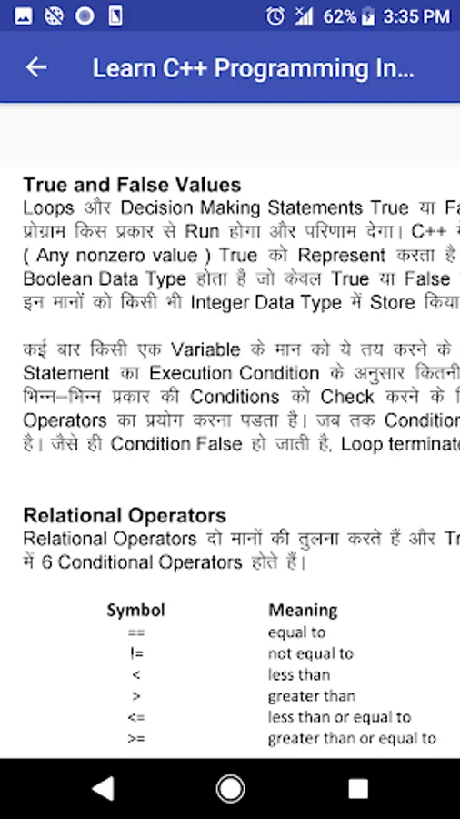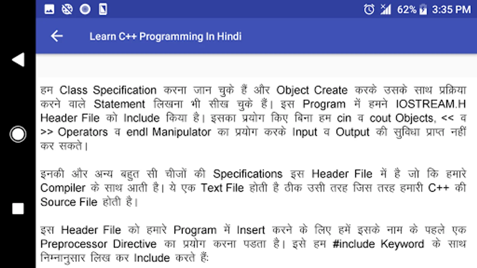हिंदी में सींखे C++ प्रोग्रामिंग - This App let you learn basics of c++ programming in hindi language and prepares for for better understanding of c++ language and because this app describes things in hindi so it is good and easy to understand by the people who not having access to english properly.