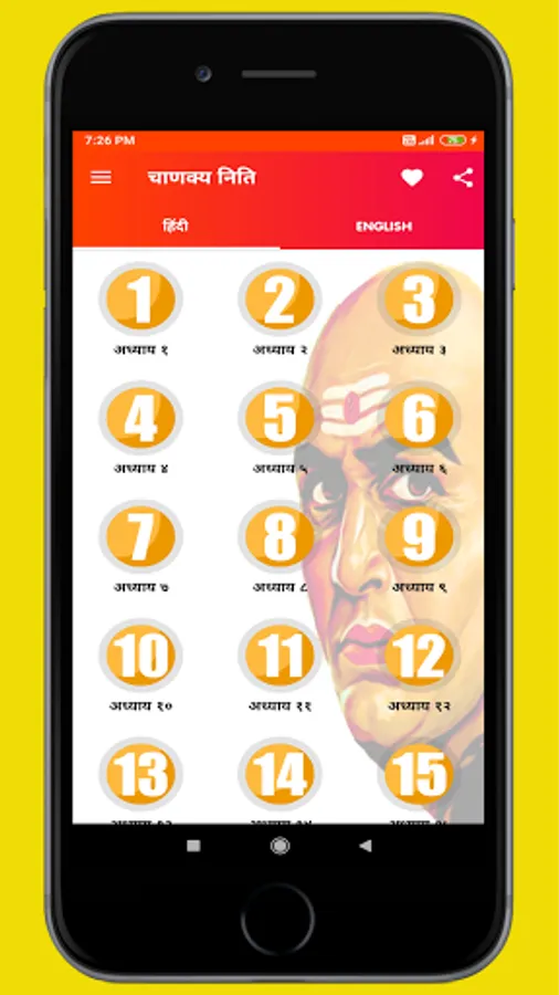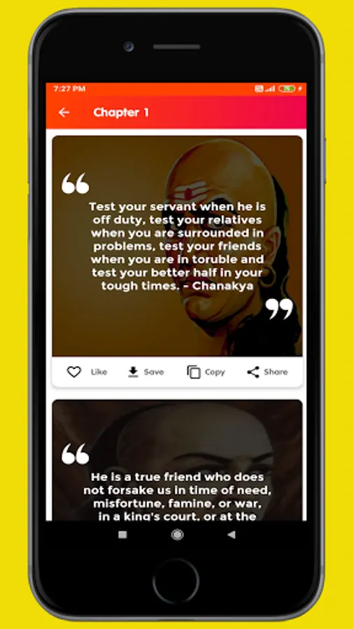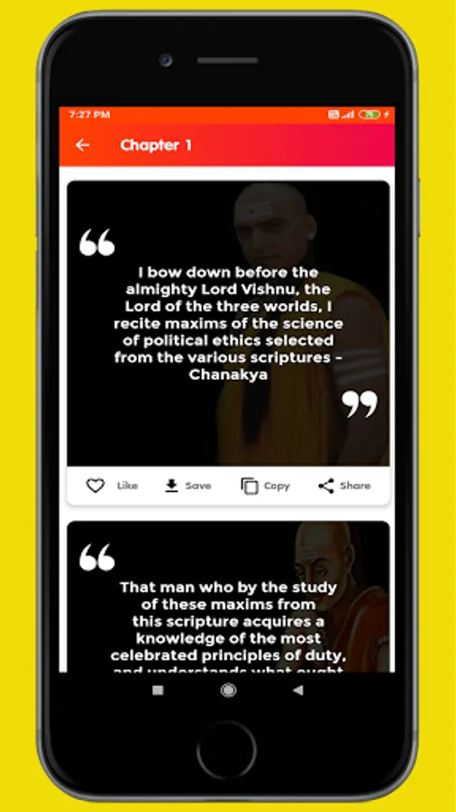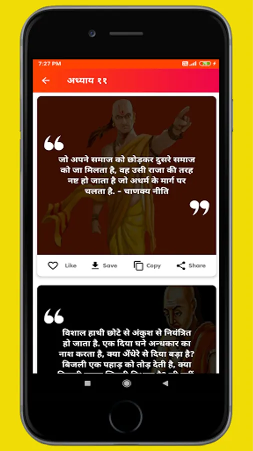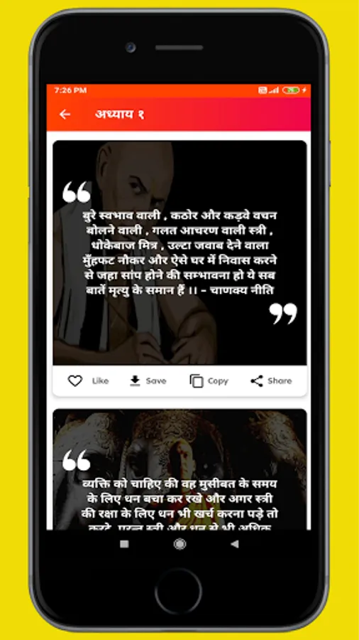This App Brings you The best Choice of Reading the chanakya niti in shortcut easy and effective manner. Chanakya Niti Hindi Quotes for life Application has been designed according to modern interface in which Neeti-Sutras of Chanakya's that tell people how they should behave and aware with different things that are related to our life. With this application, you can know the history of Chanakya's life which will let you what great personality he was and Good Quotes About Life that he used to share. This application has lots of chapters in which You can view the quotes chapter wise that will give you daily inspirational quotes as well as famous quotes about life. Some of the most popular quotes of Chanakya Niti includes in This App.