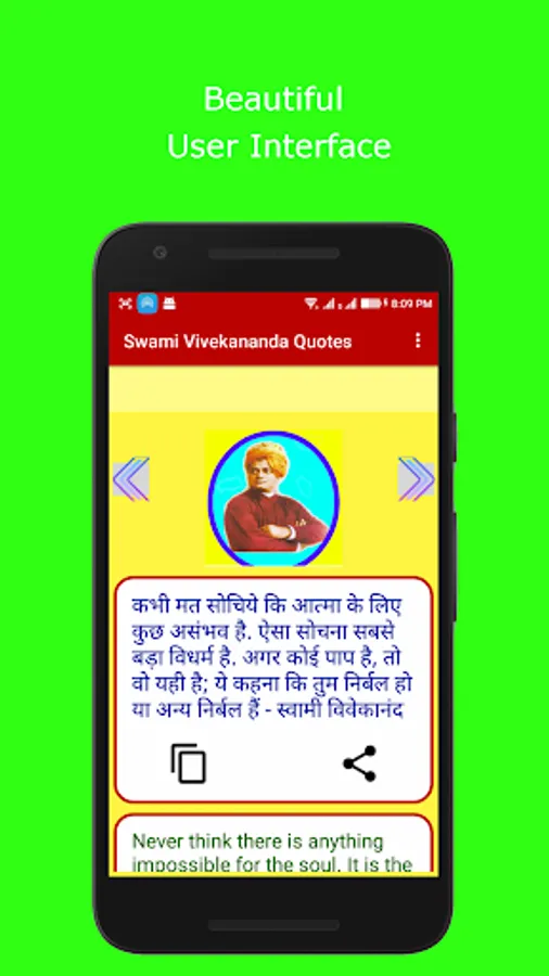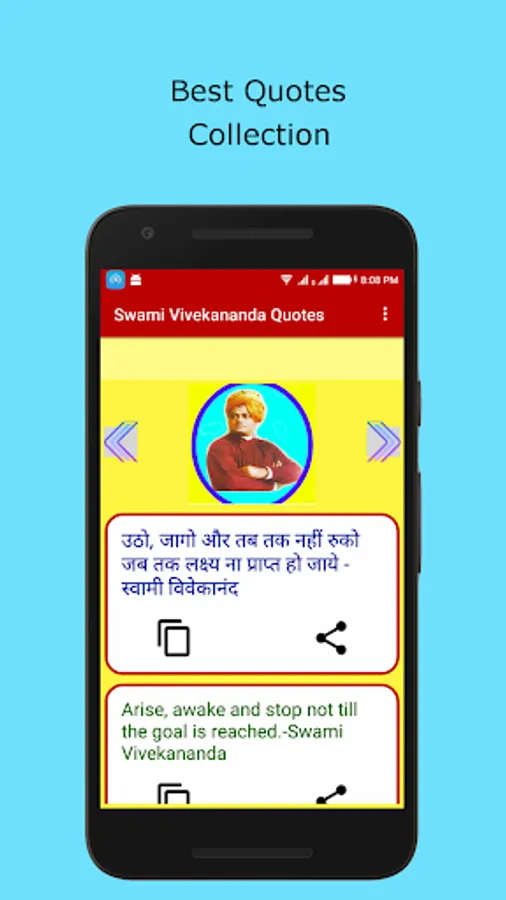 This App Contains the Hindi Quotes of Swami Vivekananda In Hindi And English Both Languages. Swami Vivekananda Quotes In Hindi App Provides you the quotes from Swami Vivekananda,it will aware you with some amazing fact of Swami Vivekananda and the life style of him.Swami Vivekananda (1863-1902) was a highly influential and inspired Indian sage. Chief disciple of the 19th-century saint Ramakrishna, he was a key figure in the introduction of the Indian philosophies of Vedanta and Yoga to the Western world and is credited with raising interfaith awareness, bringing Hinduism to the status of a major world religion during the late 19th century.