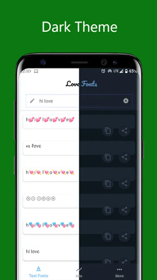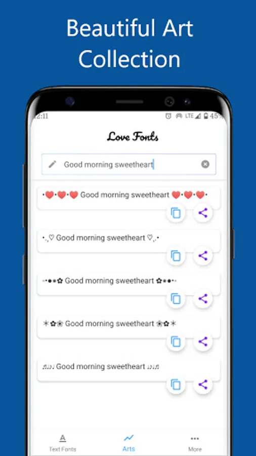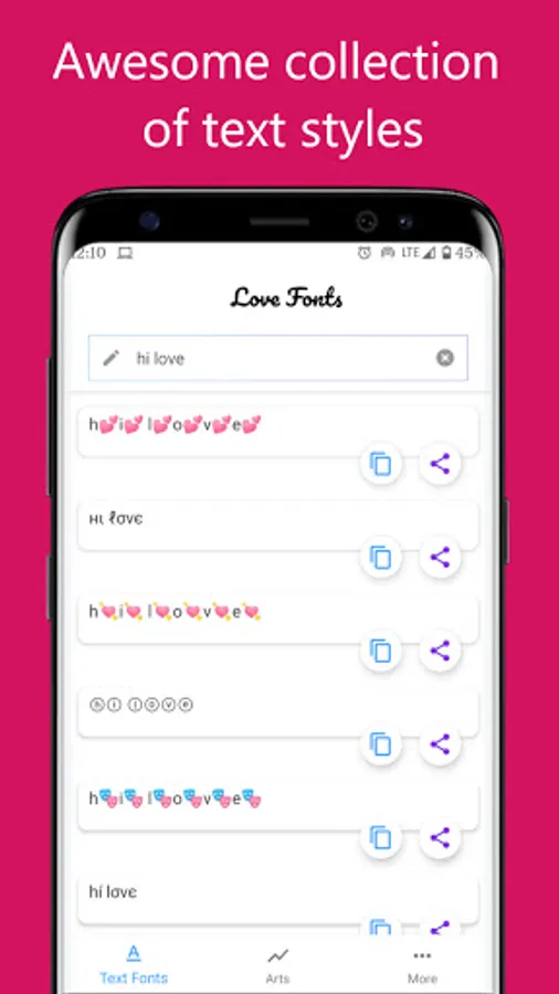 Love Fonts has many font styles to create impressive and decorative texts to share on any social medium or chat app with just few clicks. Create stylish messages with stylish fonts available in Love Fonts app.