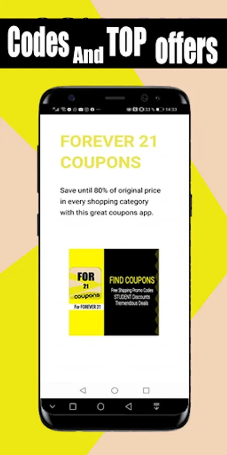 This is great and easy to use & you can get many great offers. Within this coupon, you will find all Coupons for forever 21 instantly. Enjoy coupons and deals at your favorite stores. An useful coupon where you find many promo codes for always 21 . You will find in this useful app many Smart Coupons, promo codes, discounts and great deals for forever 21.