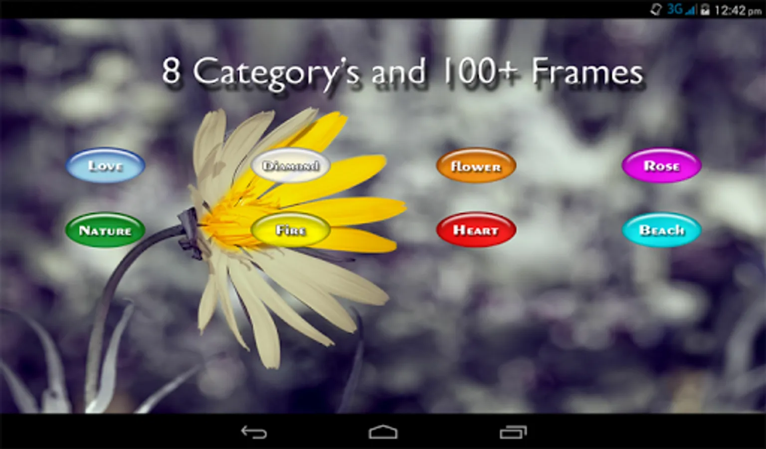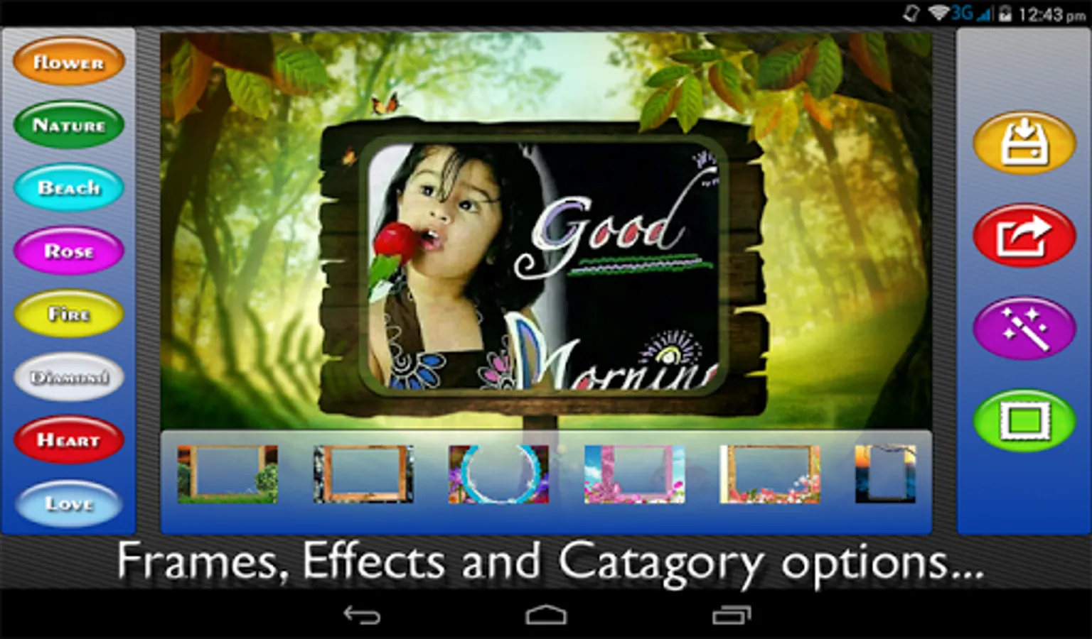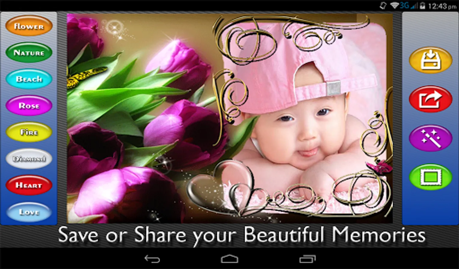 * More than 8 categories of Frames like Love, Diamond, Flower, Heart, Nature, Rose, Fire and Beach Frames...