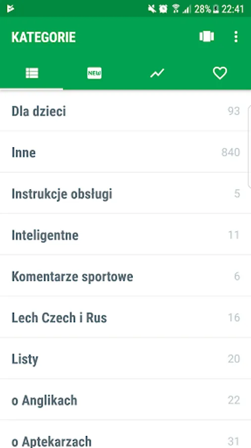 Download the application "Jokes, pieces and biscuits XXL", in which you'll find the best, unique pieces and jokes divided into 100 categories. All jokes are built into the application, so you do not need internet access to read them. With our application reading jokes will become your ritual, you will do it more often than you browse pages with memes like Kwejk, jBZD, 9gag. Even on these websites you will not find a dose of good humor as in our application.