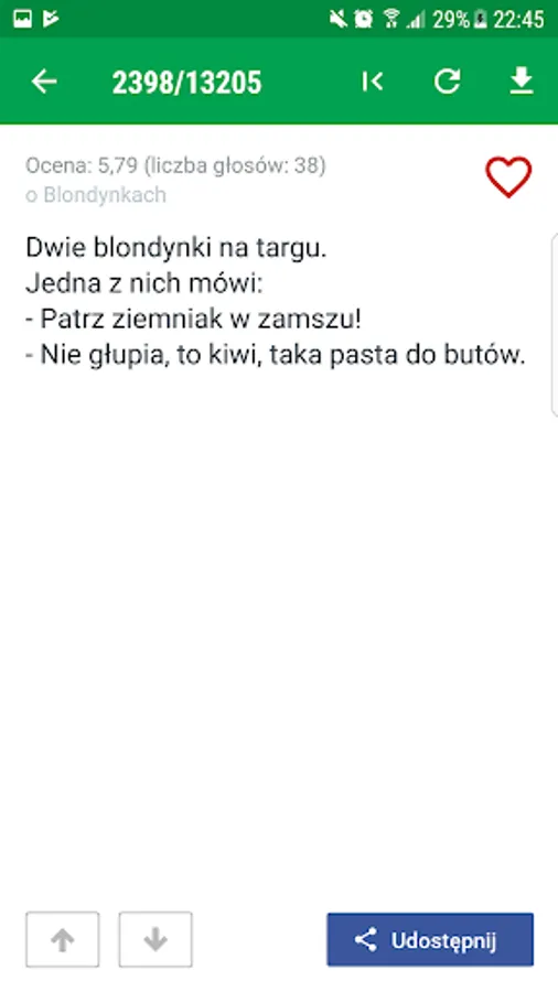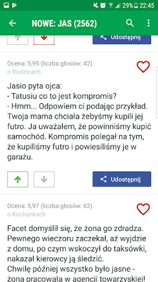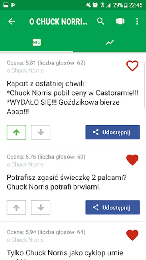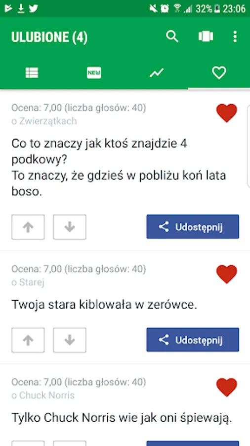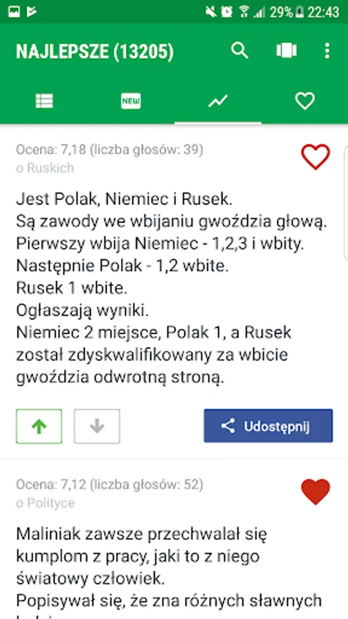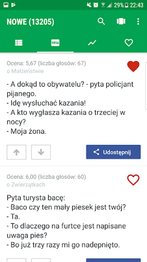 The pieces can be viewed in several different ways: new, best or favorite. In the best category, jokes are sorted against the rating issued by users. You can also influence the position of the piece in the ranking by assessing it "on plus" or "on minus". You can also create your own list of favorite jokes, just click on the "heart" icon