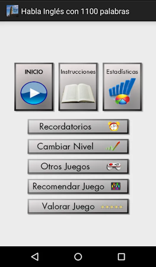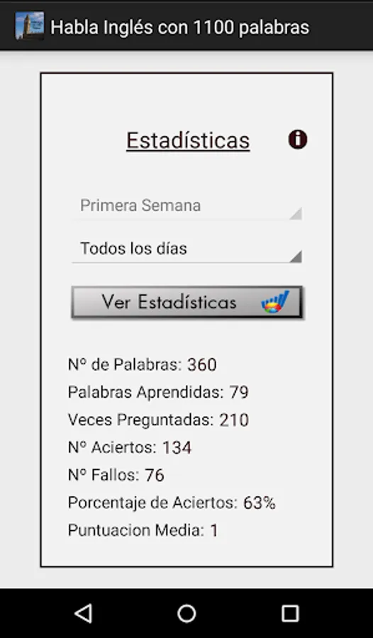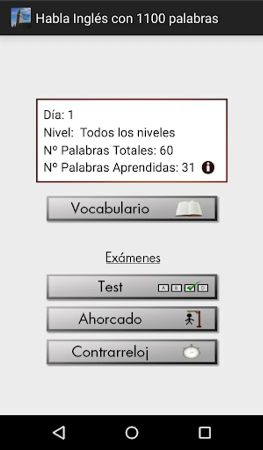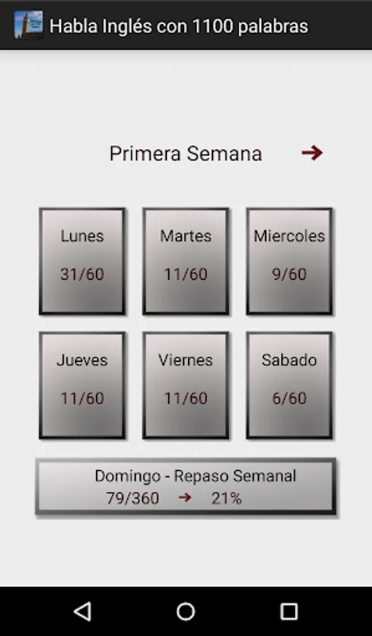 Once the level you choose, you'll start learning. In the start menu the weeks and days are displayed. To learn the vocabulary we recommend that every day dedicate between 10 and 15 minutes. Try to set your mobile phone, an alarm to remind you every day that you learn new words, this will help you be more consistent. Each day has between 20 and 60 words as the number of levels you choose.