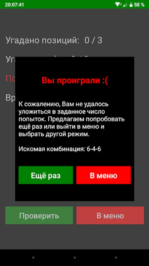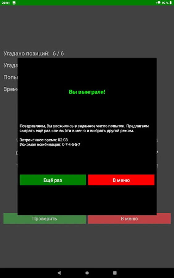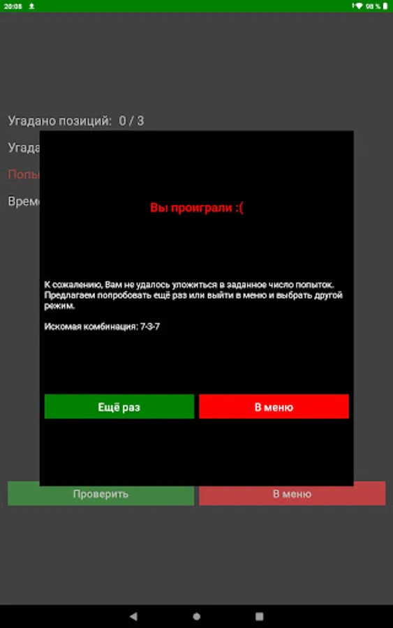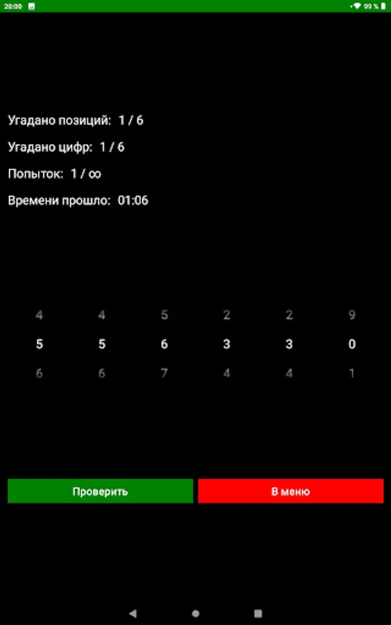 Find the correct combination of numbers. A simple logic game in which you need to guess a random combination of numbers based on two indicators: the number of guessed numbers and the correct positions. An uncomplicated game that will help pass the time a little.