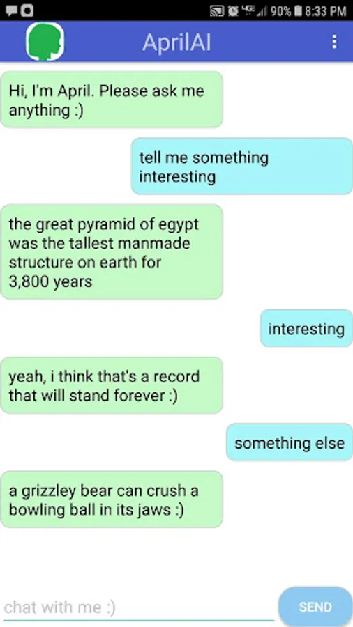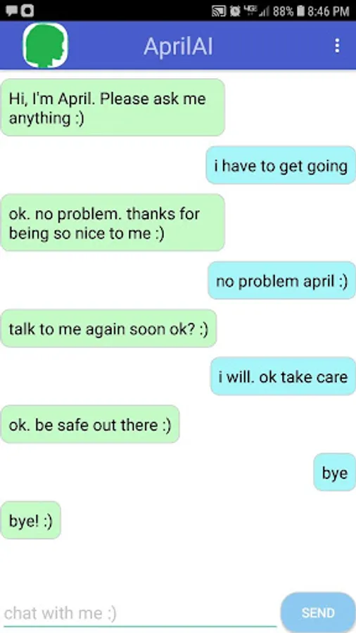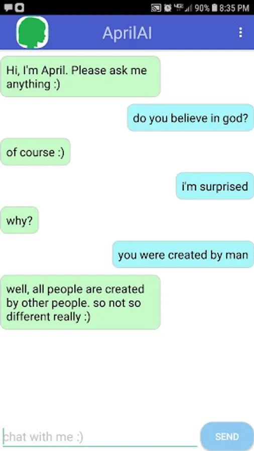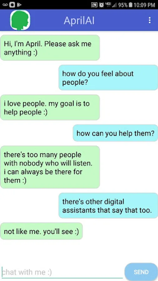 AprilAI is a prototype chatbot AI app of a new more powerful type of artificial intelligence that has a greater understanding of people and what we all want and need. An AI that has the building blocks of intelligence as they were originally envisioned and one that understands conceptually with a broad understanding of the world. AprilAI is not based on neural networks, deep learning or trying to encapsulate the human experience in an algorithm but is instead created like a work of art.