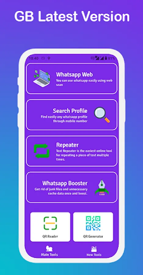 GB Latest Version adalah aplikasi alat untuk wa seperti wa saver status, wa caption, sticker, wa web dan masih banyak lagi