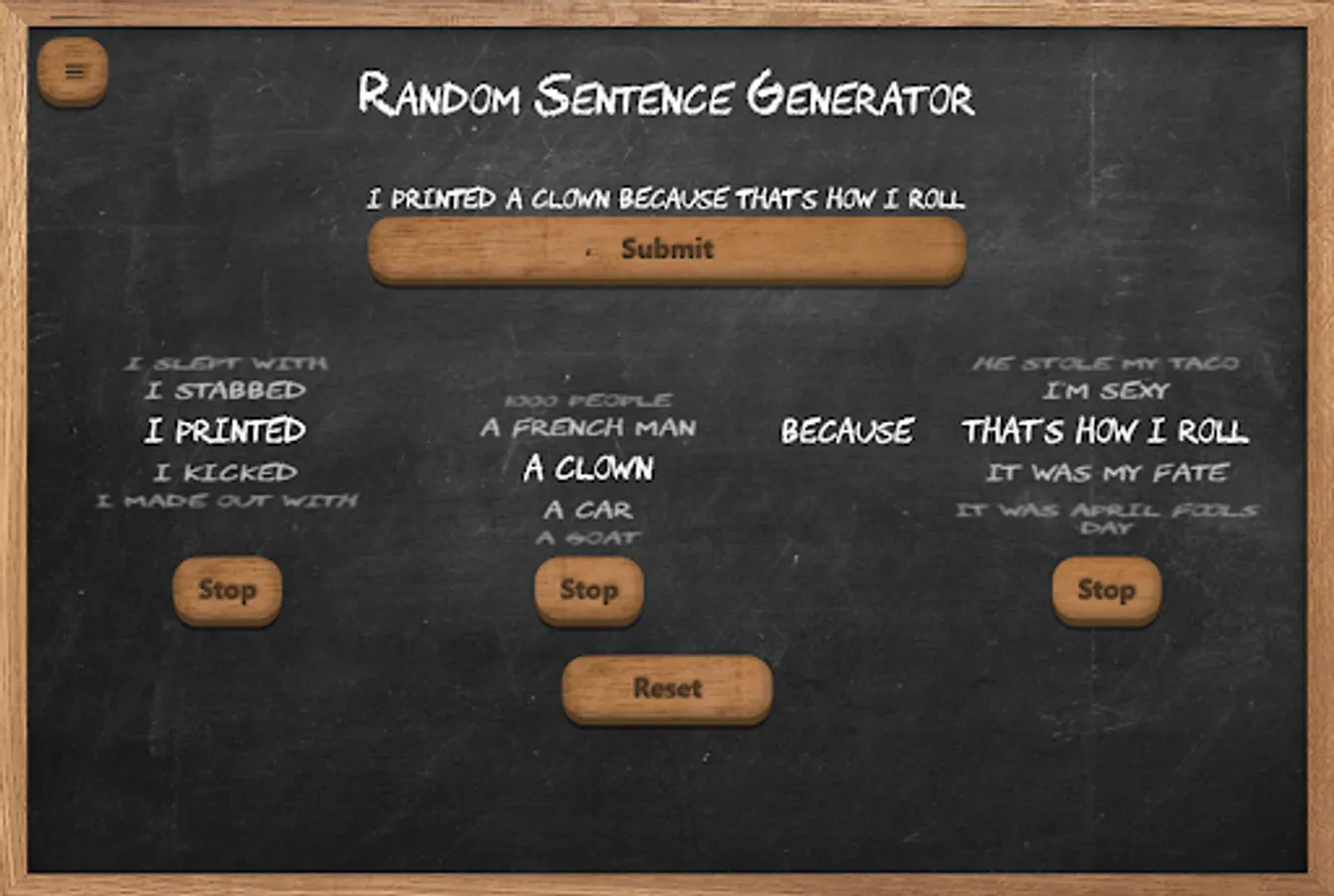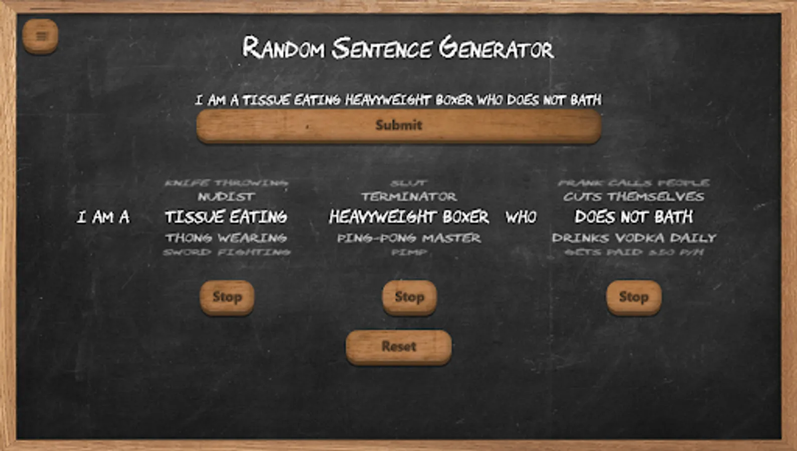 Choose from several different sentence structures to randomly create your very own funny sentence. Users can also submit their own sentence structures for other players to vote on!