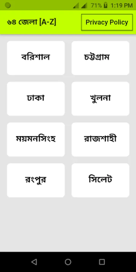 ৬৪ জেলার পূর্ণাঙ্গ তথ্য ও উপাত্ত [A-Z] একটি শিক্ষা মূলক অ্যাপ যা বাংলাদেশ সম্পর্কে সাধারন জ্ঞানার্জনে অত্যন্ত সহায়ক।