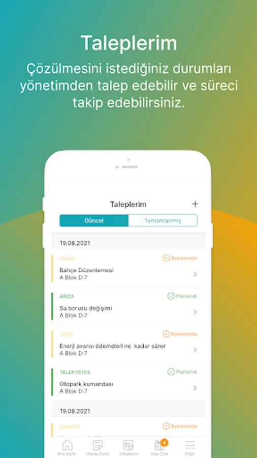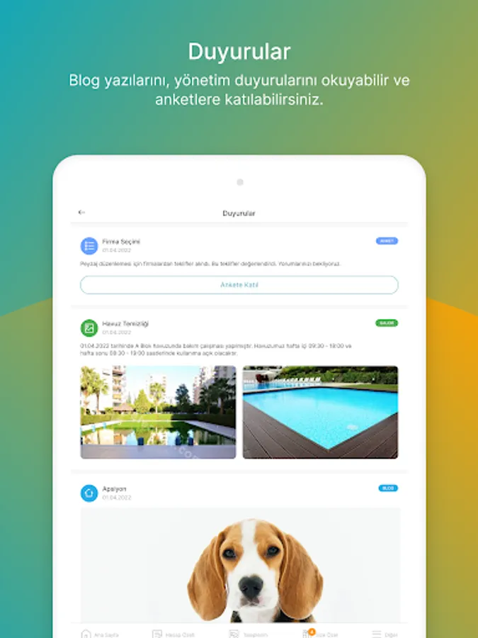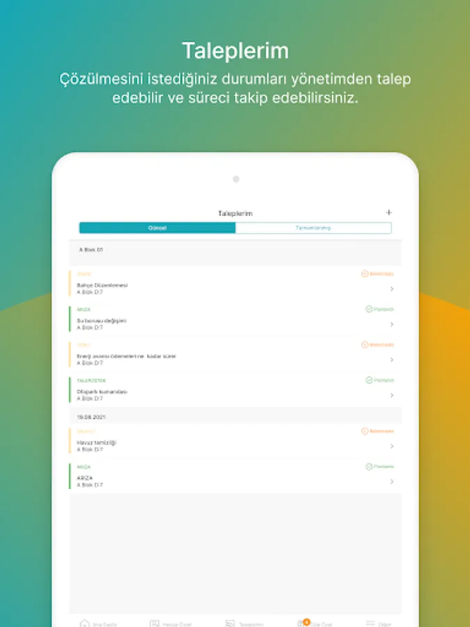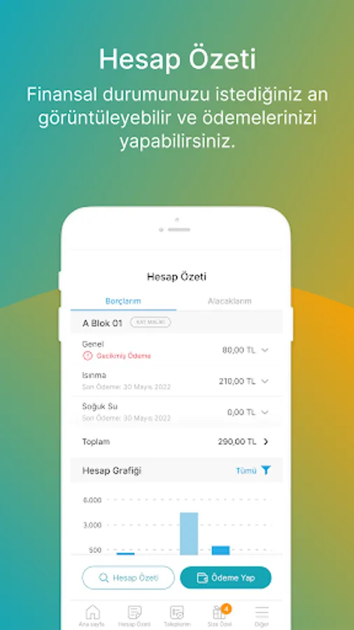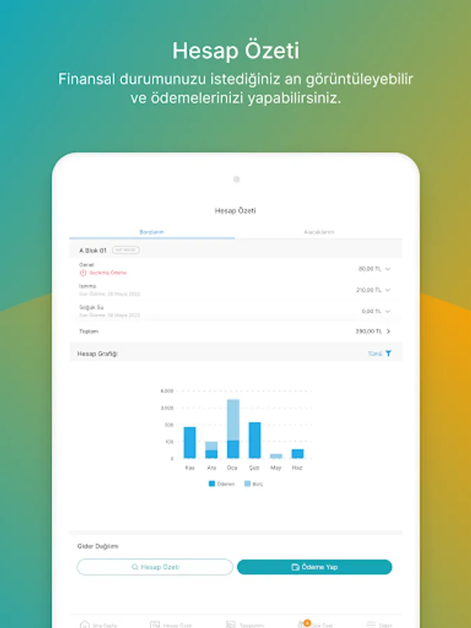 You can view the dues, heating, hot / cold water, common area electricity / water payments, fixture payments and financial status of your flat and your tenants at any time from your phone or tablet, and if you wish, you can pay your dues with your online credit / debit card, and view your receipts and account statements easily.