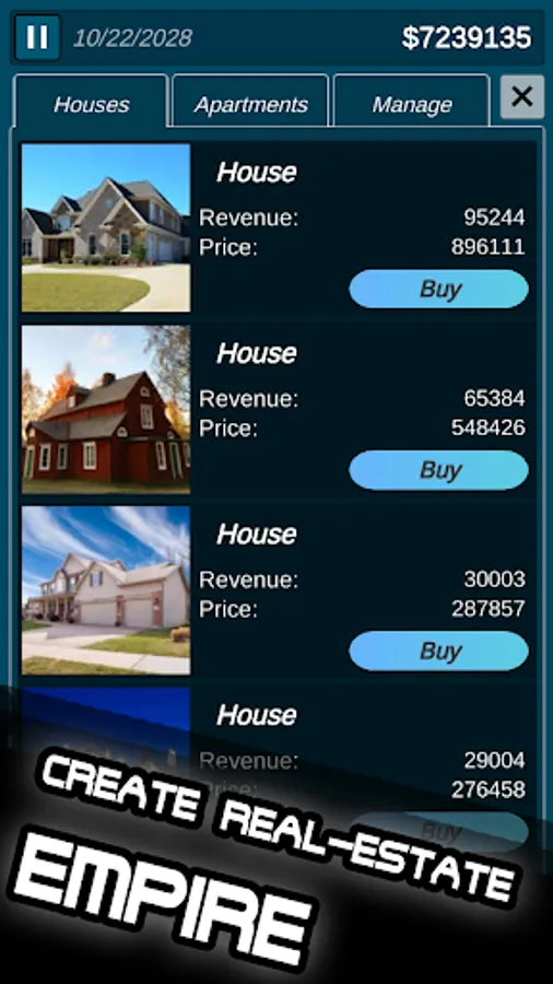 Buy houses and apartments as the market fluctuates. Find amazing deals to realize sweet profits. Expand your real-estate empire and found your own property management company to further increase your profits!