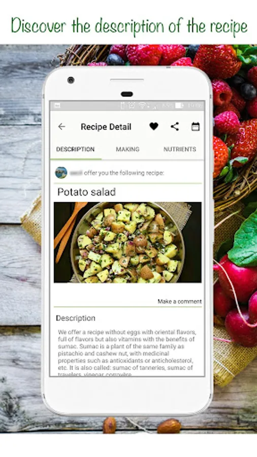 Each user can comment the recipes and gives his opinion and communicate his experiences with the other users. With Veganized, you can share your vegan recipes with all your friends to make the people discover the veganism. You can promote you own blog, or social network page, Veganized allows you to enter an URL link to your blog, page, or web site where the original recipe can be found.