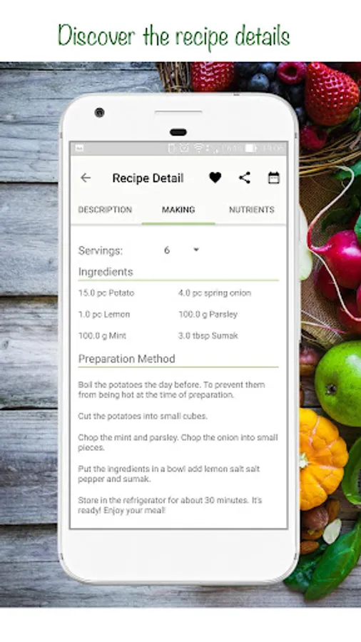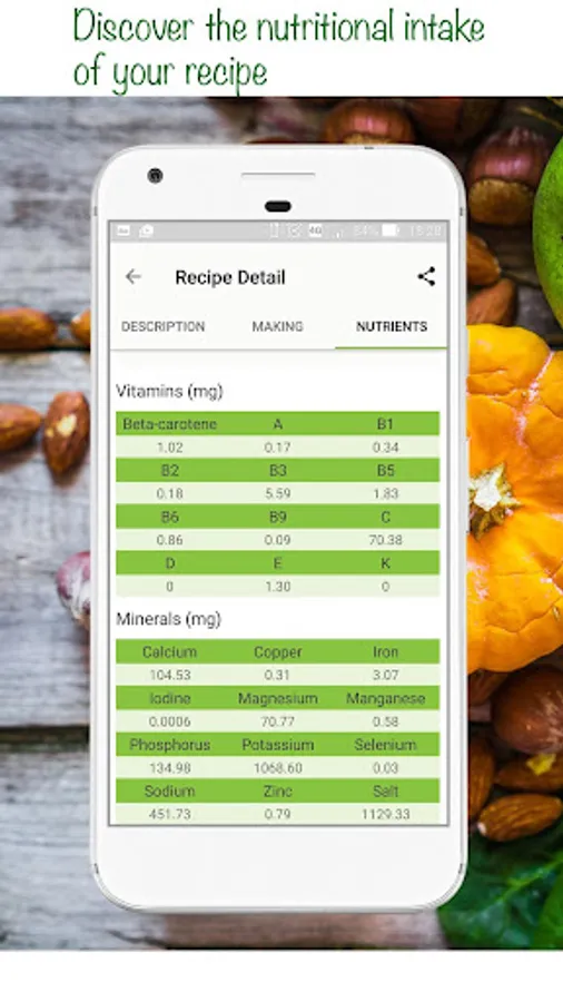 Finally, you can prove to your not vegan friends and family that vegan dishes can give you the same nutrients intake that others ordinary meals. With the Nutrients functionality of this app you can check all the necessary information for each vegan recipe: energy, macronutrients distribution, fibers, vitamins and minerals. Veganized gives this information for all the vegan recipes available, and for each serving of the recipe. When a user creates a vegan recipe, this information is computed automatically in function of the ingredients chosen.