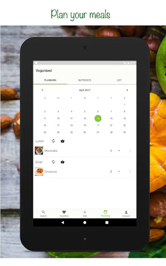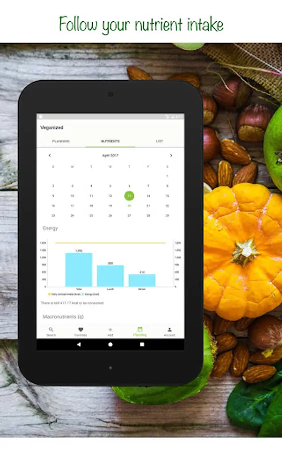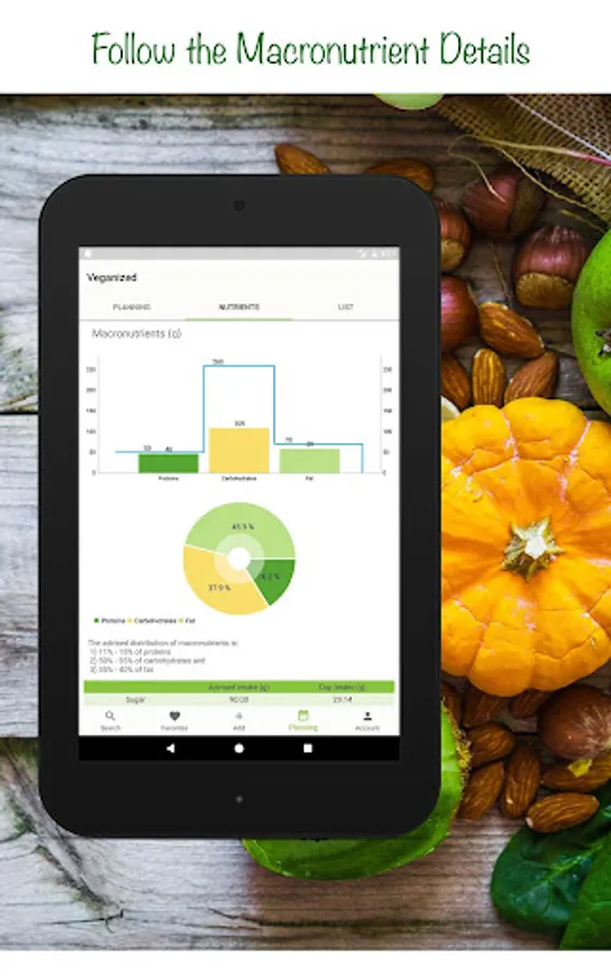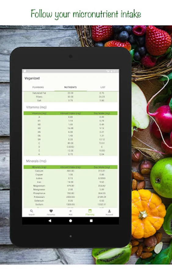 Veganized allows to plan your meals for each day of the year. You can follow your daily nutrient intake and compare with your own advised intake, personalized in function of your age, sex, size, weight and physical activity. You can also compare the macronutrients distribution with the advised distribution. The planning functions is ideal for the users following a diet, or new on veganism and vegan food.