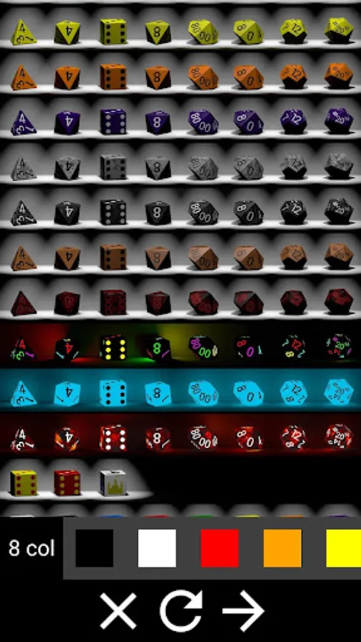 - Dice colours: white, black, red, blue, green, yellow, orange, purple, white marble, black marble, cyan glow, lava, neon, copper, red "celtic knot", Fudge, Settlers, black and bronze, and black and aluminium dice.
