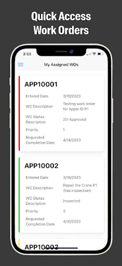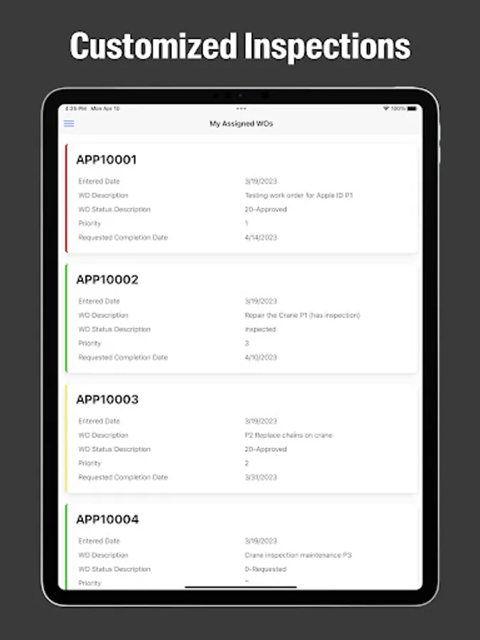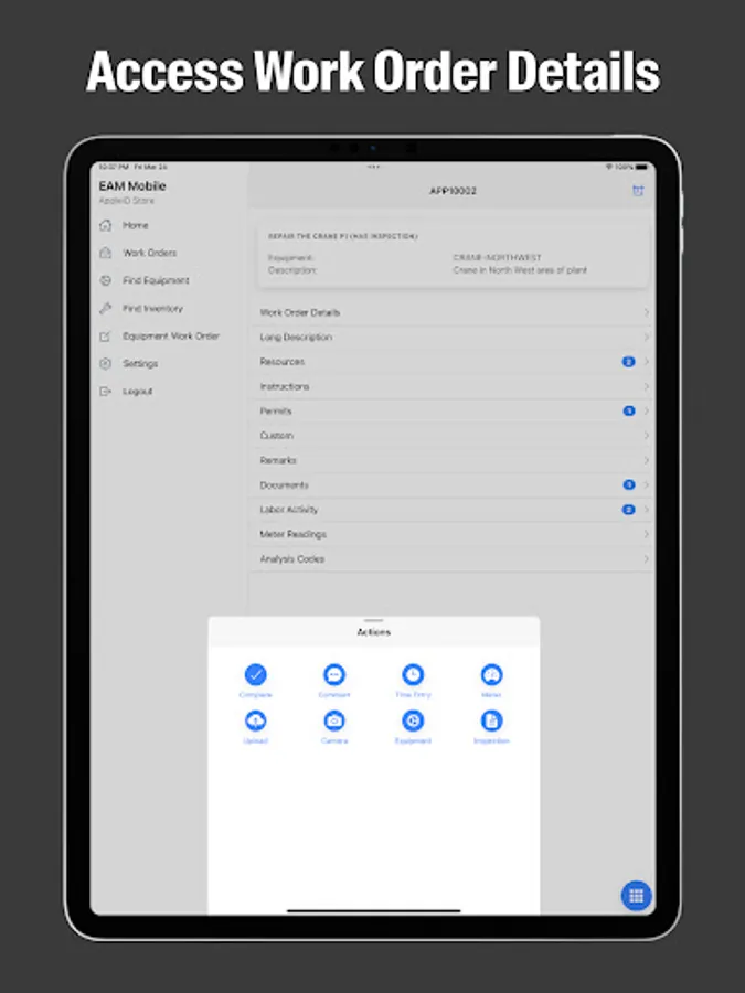 -Time entries, failure codes, meter readings, and comments can be captured to further document the work and provide rich analytical data for continuous improvement and root cause analysis initiatives.