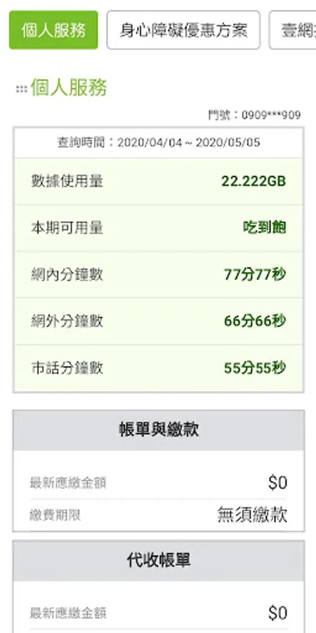 1.用量查詢:數據用量、網內分鐘數、網外分鐘數、市話分鐘數。