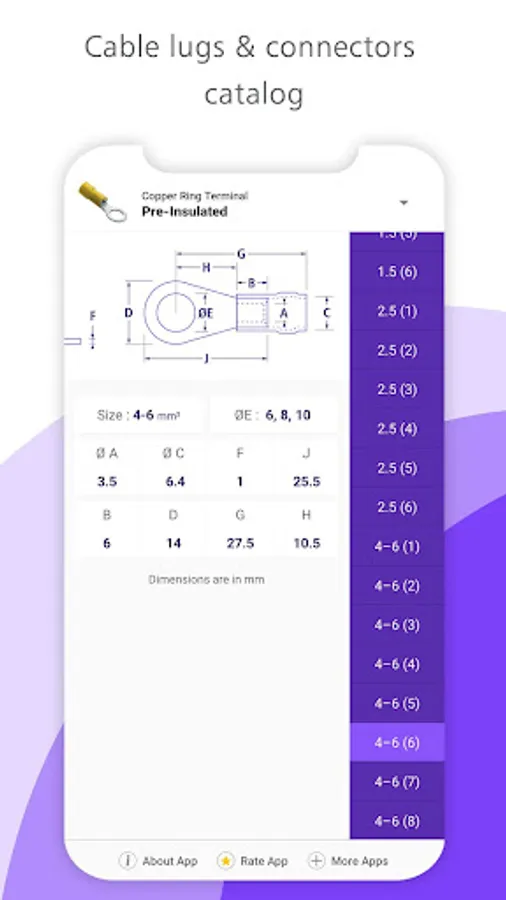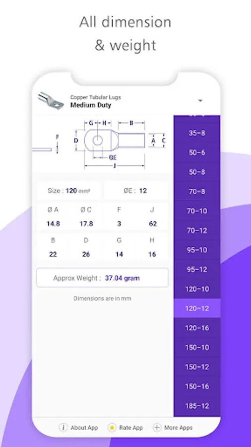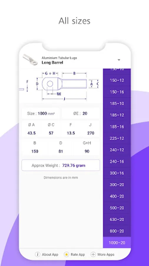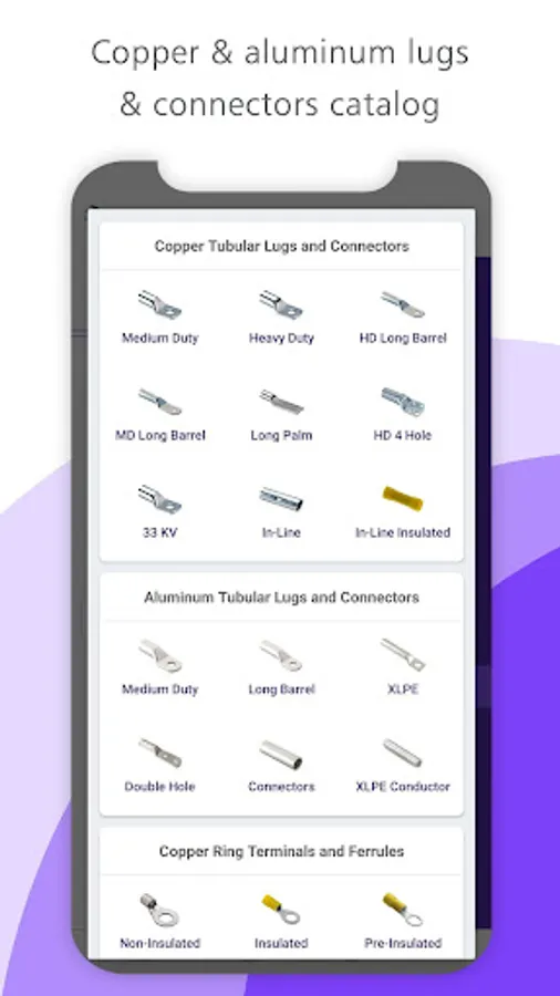 Application for standard copper and aluminium cable lugs and connectors with all sizes, dimensions and weight.