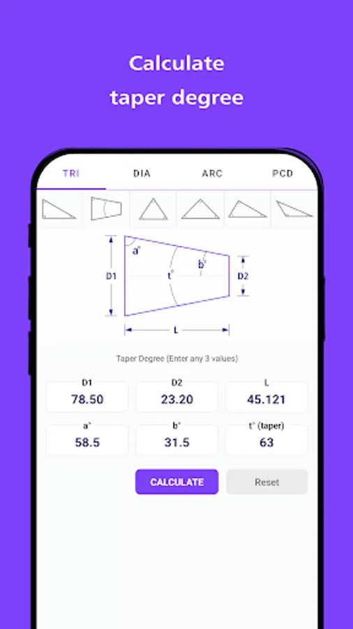 triangle degree, taper degree, and hypotenuse length with additional options such as Arc radius, angle, cord length, cord height, segment area, sector area, PCD, and circumcircle dia. & incircle dia. of the geometrical shapes.