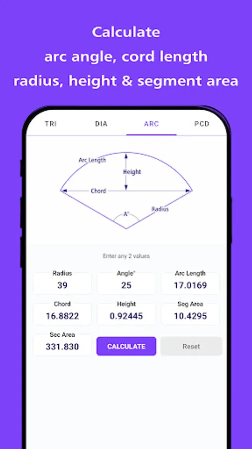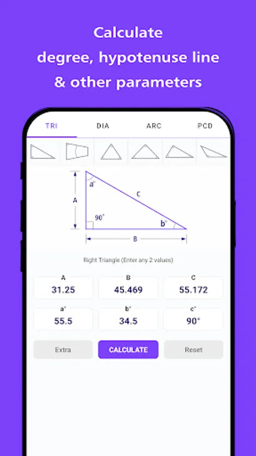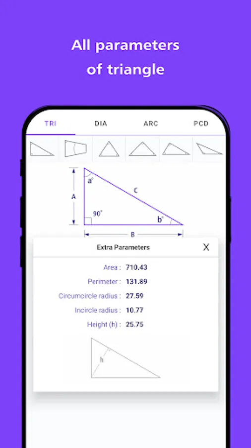 Easy triangle calculator application for finding degree, taper degree and hypotenuse length with additional options such as Arc radius, angle, cord length, cord height, segment area, sector are, PCD and circumcircle dia. & incircle dia. of the geometrical shapes.
