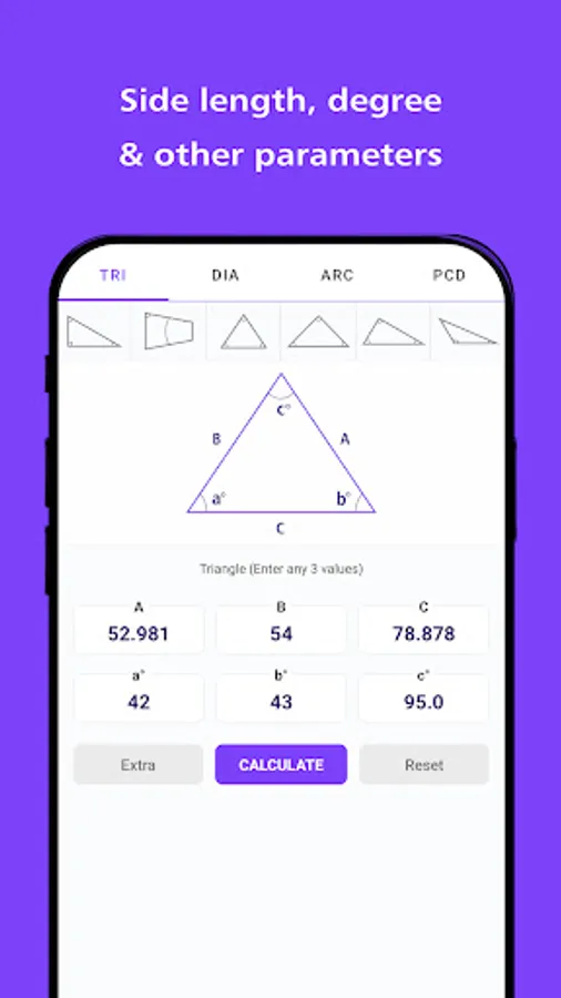 Find out degree and sides by entering two values for Right triangle and three values for triangle, this triangle calculator app also provides you many parameter like, Side length, degree, Area, Perimeter, Circumcircle radius, Incircle radius and Height