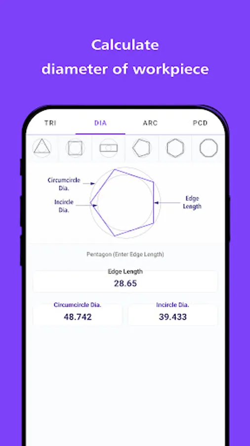 Circumcircle diameter and incircle diameter of the geometrical shapes (diameter of the workpiece)