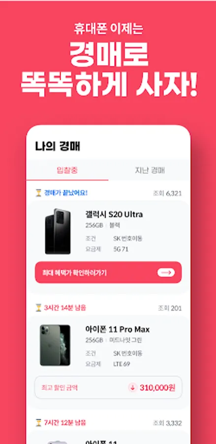 - 경매 방식의 스마트한 핸드폰 구매 : 판매자들끼리 경쟁하여 최적의 조건으로 구매할 수 있습니다.