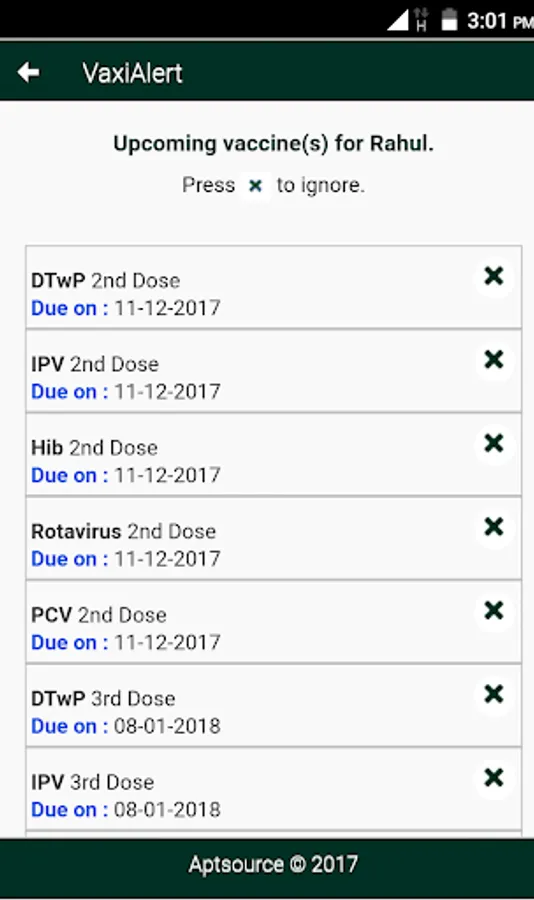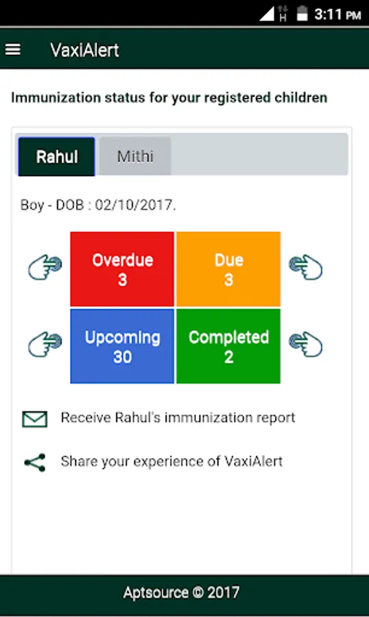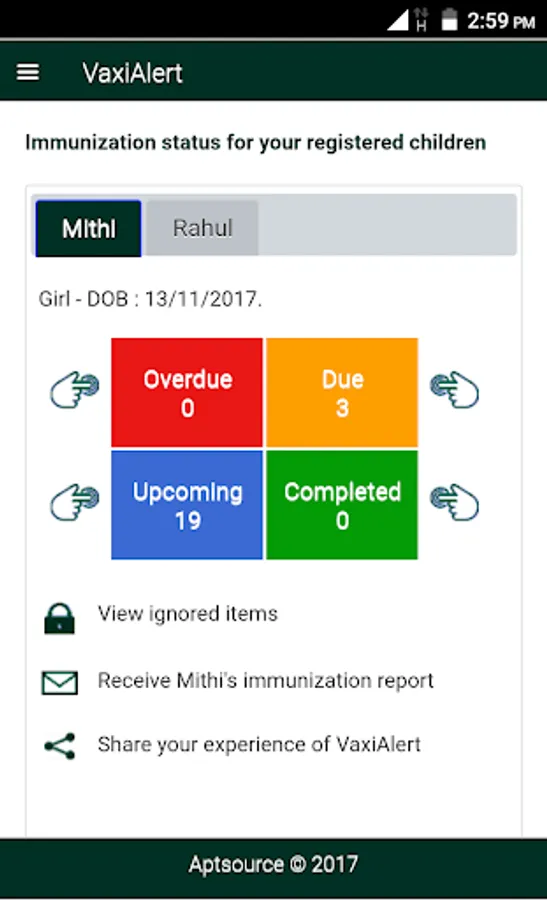 Vaxialert is the first dashboard based vaccination tracker app and vaccination reminder app targeted for smart parents in need to track their child’s vaccination shots. The heart of this app is a dashboard displaying the overview of current vaccination status with colour coded vaccination alerts to help parents interpret pending vaccination shots in an intuitive manner. Parents can delve deeper into each alert category by tapping into the respective area in the dashboard and respond to the provided Vaccination alerts.