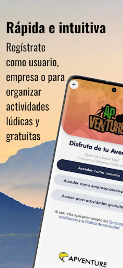 - Are you a large sports activities company? Apventure is your site, because thanks to its great virality you will be able to go even further by offering your activities and becoming an Apventure Point so that you can stand out even more in your offer.