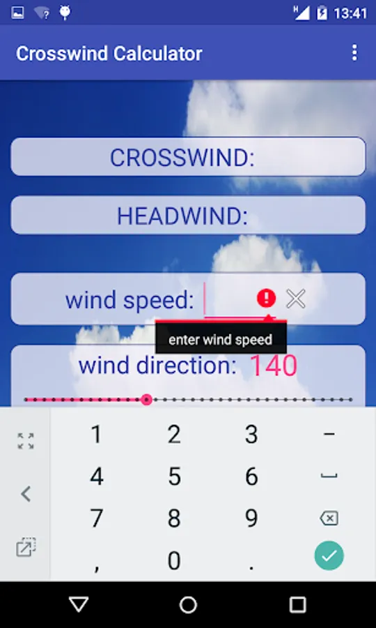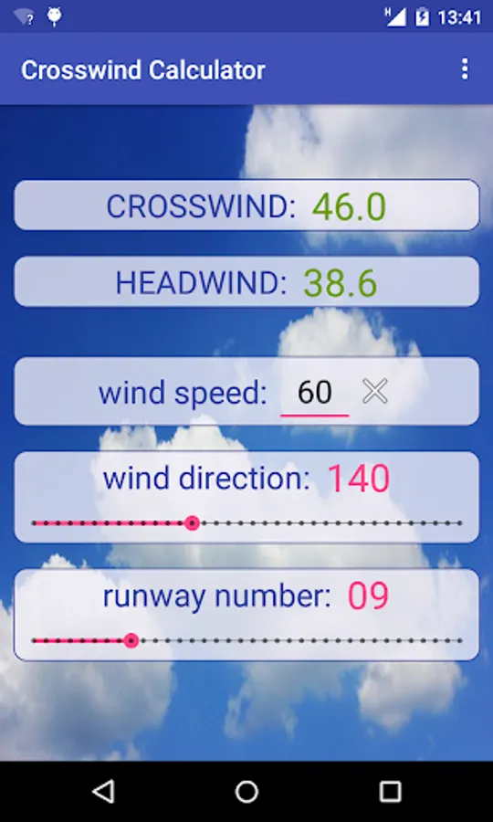Calculate real time crosswind and headwind components by using horizontal slides for selecting runway, wind direction and wind strength.