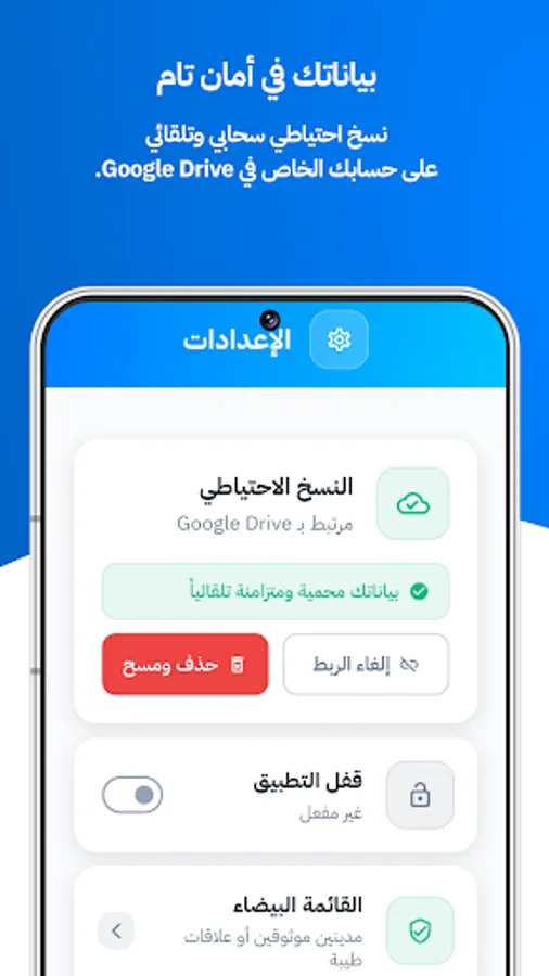 Cloud Backup: Link your Google Drive account to securely and automatically sync your data and photos.