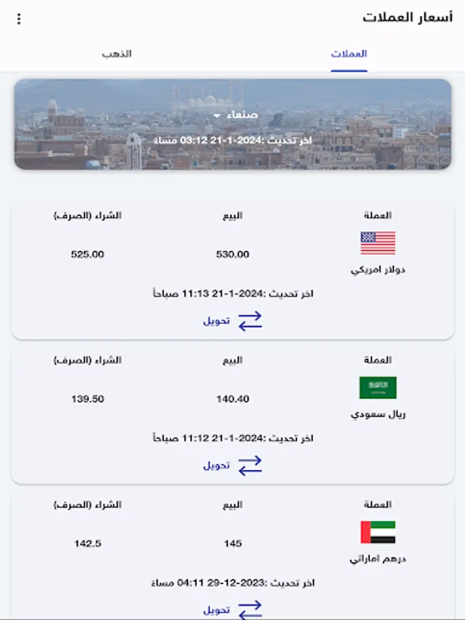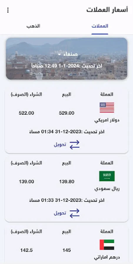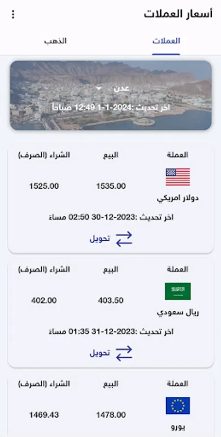 The program is distinguished by displaying the prices of currencies and gold at the local market price in Yemen at the buying and selling price at which it is dealt. It displays the price of the Yemeni riyal against the dollar, and the price of the Yemeni riyal against the Saudi Arabia today.
