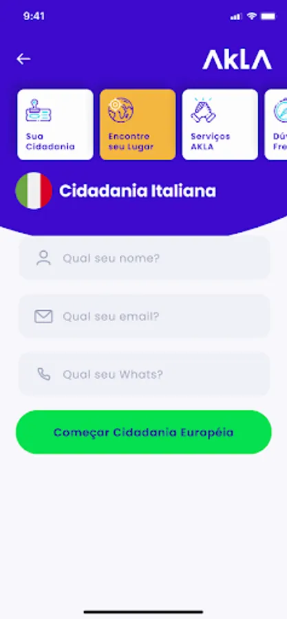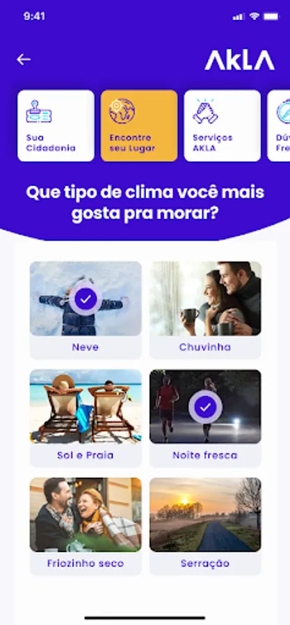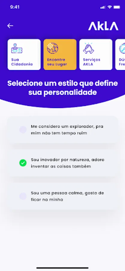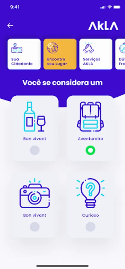 The AKLA App is exclusive for our customers and also for those people interested in finding their place in the world. AKLA generates an analysis of your personal profile based on your tastes - if you do not have an account with us - and thus guides you, based on an analysis, which country/nationality you should visit. If you have an account with us, you will be able to view the evolution of your consultancy with Aquila.