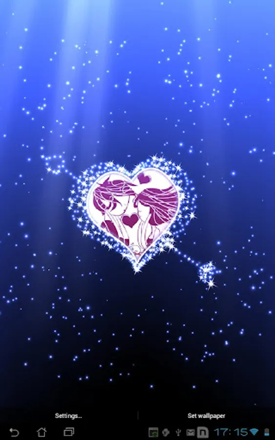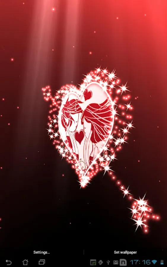 This Love Live Wallpaper is full of Hearts and you can see the love cycle, in the first phase small customizable hearts swim up until once exploits in small light particles. This particles come together to form a live 3D big heart with lot of spirals around that is pierced by an arrow. The arrow cleans the big heart of spirals and form beautiful messages (that you can customize) inside the big heart and your custom image. When all messages are showed, big heart explode in hundreds of particles and the cycle begins again!