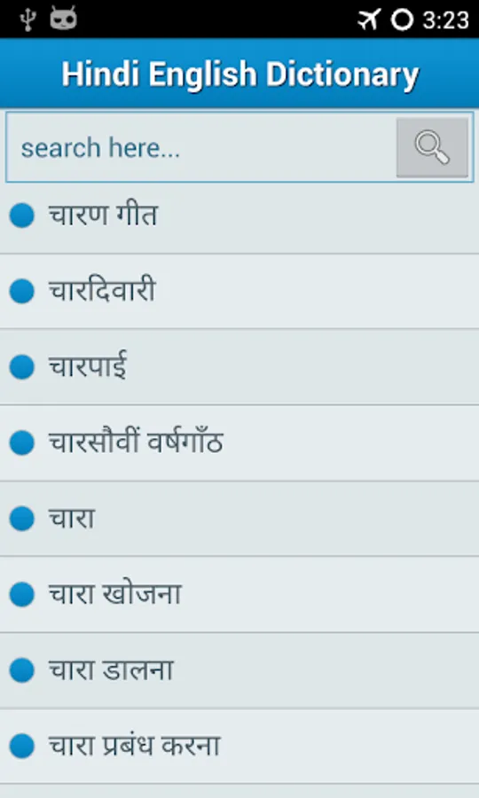 - Has facility to input in Hindi and search Hindi Words while typing.