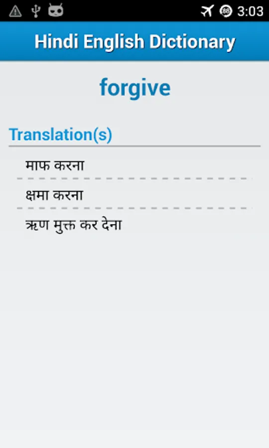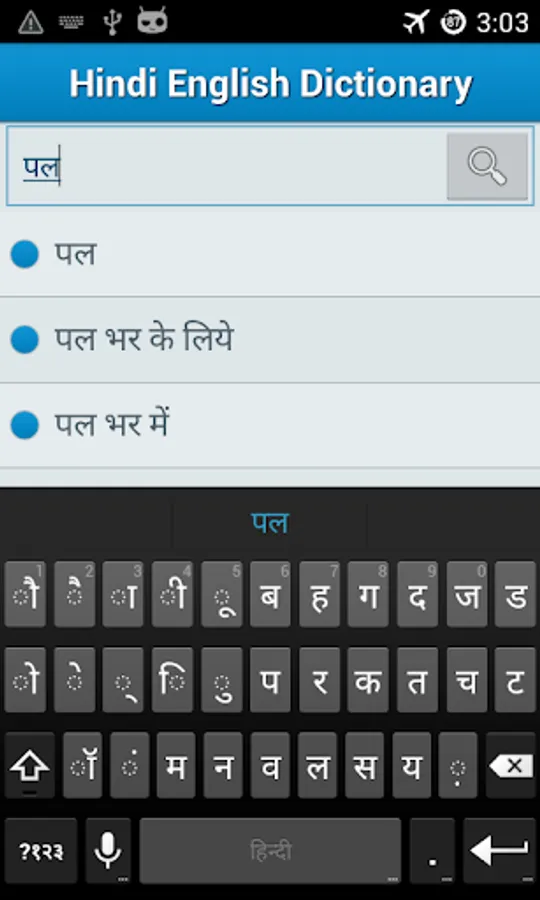 Our Hindi to English and English to Hindi dictionary works in OFFLINE mode. No internet connection is required after the app download. So you can carry this dictionary with you everywhere in ur cellphone for use when you have no net connection. This fast and free app provides detailed meaning with definition. It has the largest database of words.