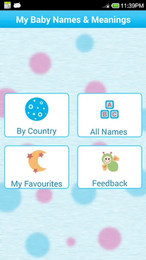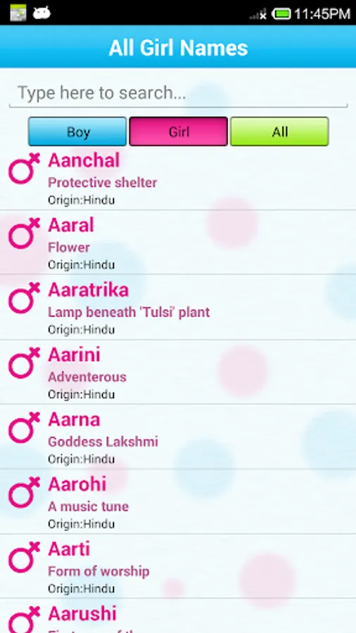 Enjoy choosing meaningful names for your kid and enjoy him / her smile at it. Get this most popular of free apps today and give your angel unique, unusual or cool pink ♀ girly / blue ♂ boyish names; also for unisex names. Wish you the best for choosing very good names for your new born babies.