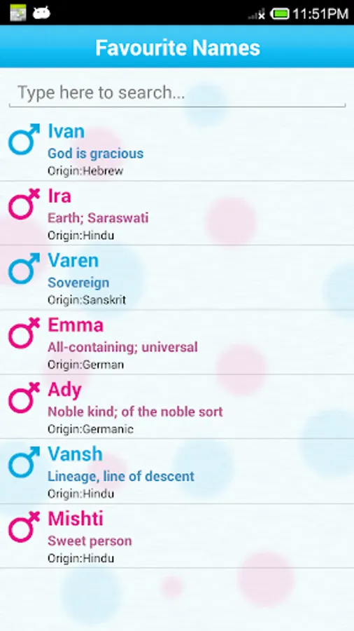 ♥ No need for the tiresome job of name search on internet/ websites. This app is also to know what is the meaning of your name.