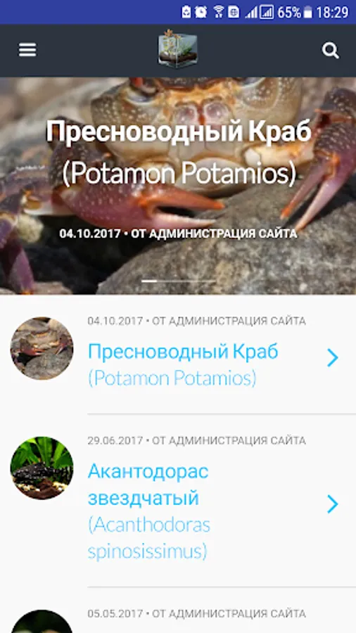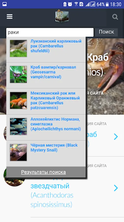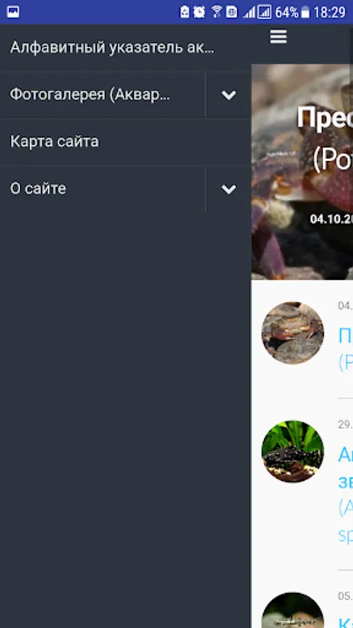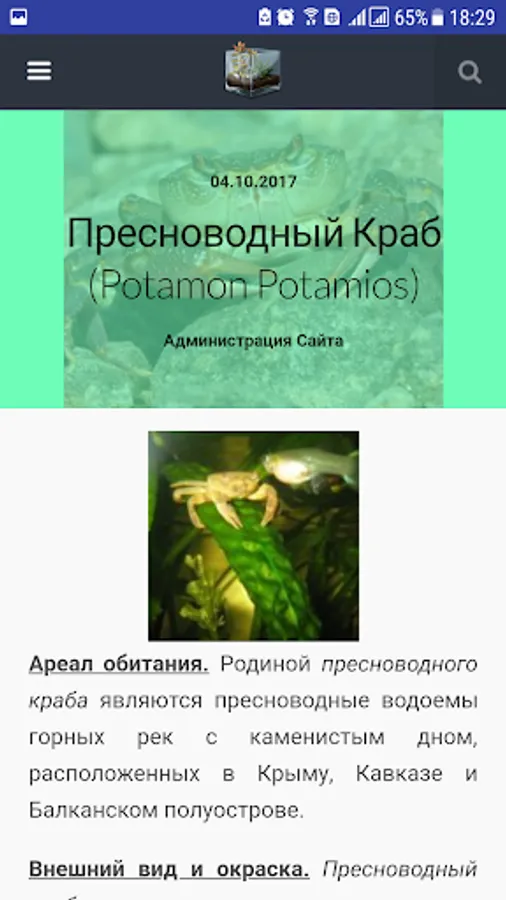 Description and photos of more than 200 kinds of aquarium fish, plants and all kinds of shellfish. Site contains a description of content reproduction methods and aquarium occupants from molluscs to cancers and fish.