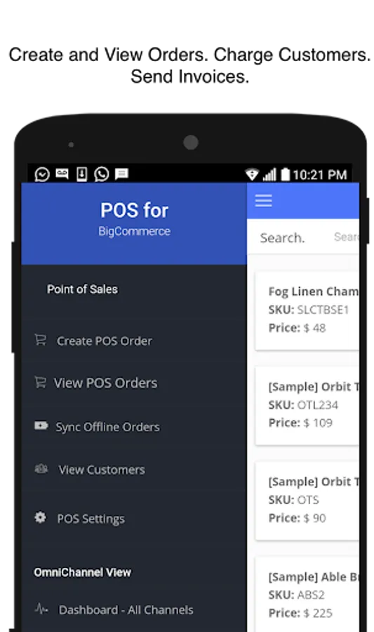 Android point-of-sale app that gives you everything you need to take payments and book orders on BigCommerce platform. Accept card payments through Stripe/PayPal gateway or register external payments. Automatically sync all orders and corresponding inventory adjustments in real-time. There are no long-term contracts and no commitments.