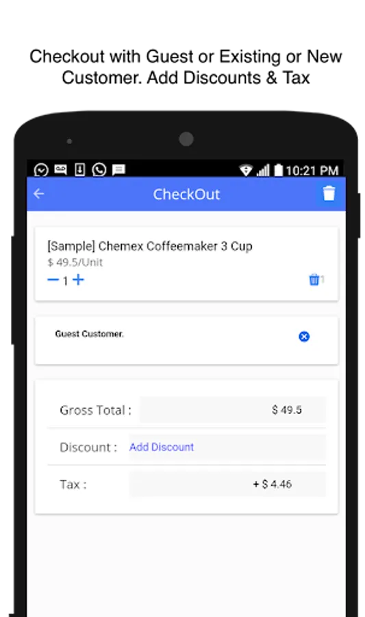 Tax Rate and your physical store address can be set in the app settings to incorporate with orders and invoices. New Customers can be added if desired. Guest checkout flow is optimized for fast order processing.