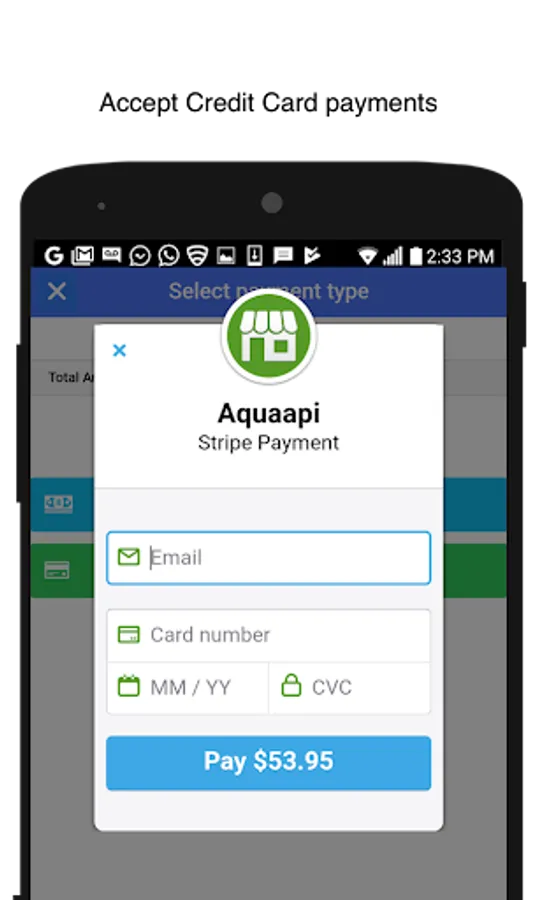 Bring your own PayPal or Stripe business accounts to start accepting credit card/debit cards payments in person. Payment for Stripe or PayPal allows you to type in card numbers manually. No need for a card reader. Accept all types of cards including VISA, MasterCard, Discover, American Express, JCB and Diner's Club. Also, accept PayPal as a payment method while using the PayPal gateway.