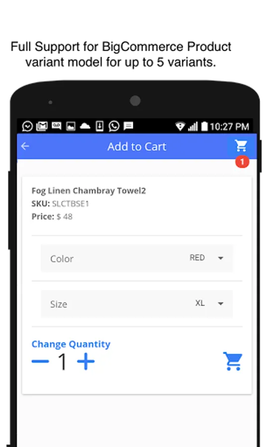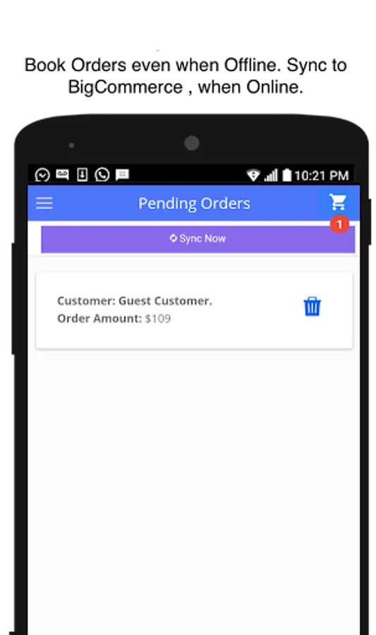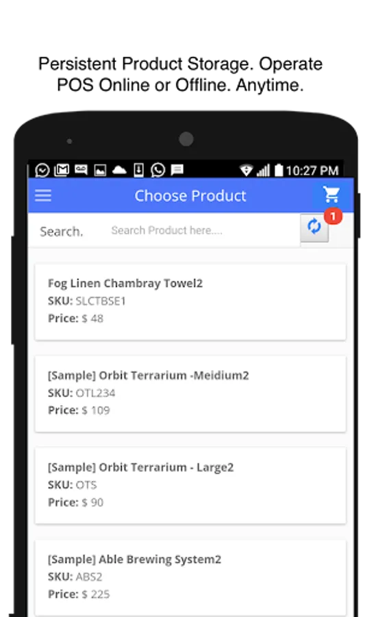 This application integrates seamlessly with your BigCommerce platform (using authorization APIs) and mirrors existing products and customer details to your app. Products are stored on your mobile and available at all times, whether online or offline. Products can be of any type, including with variants.