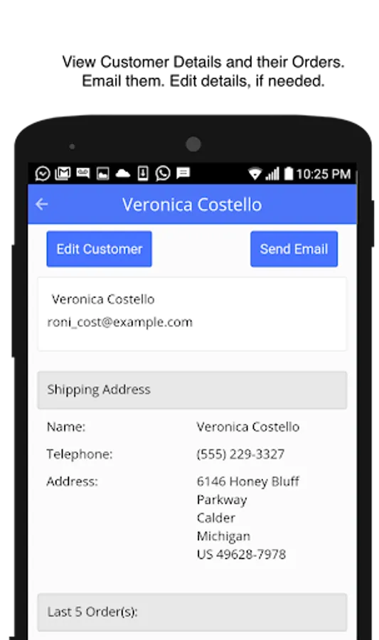 * Customer & customer details including email, billing and shipping address. View and update. Email customers right from the app.
