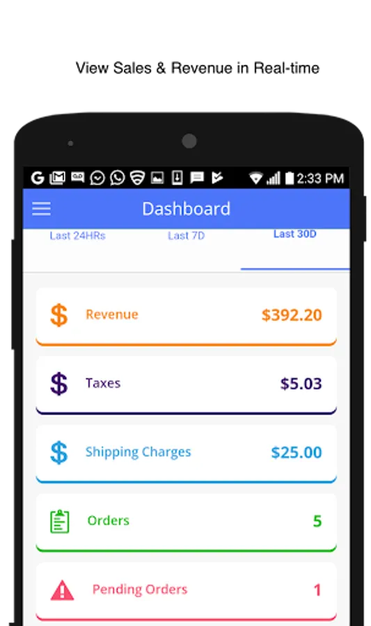 * Dashboard with Last 24 hrs sale, Last 7 days and Last 30 days